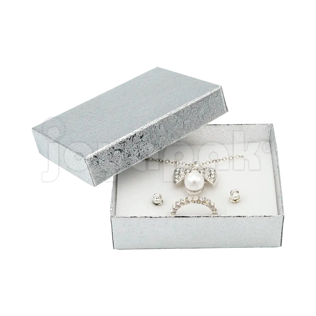 Su diseño con un impecable acabado metalizado en dorado o plateado no solo protege cada pieza, sino que la presenta con el lujo que merece. Esta caja para juegos de joyería es la solución ideal para venta directa, envíos o como un estuche de regalo que tus clientes amarán.
